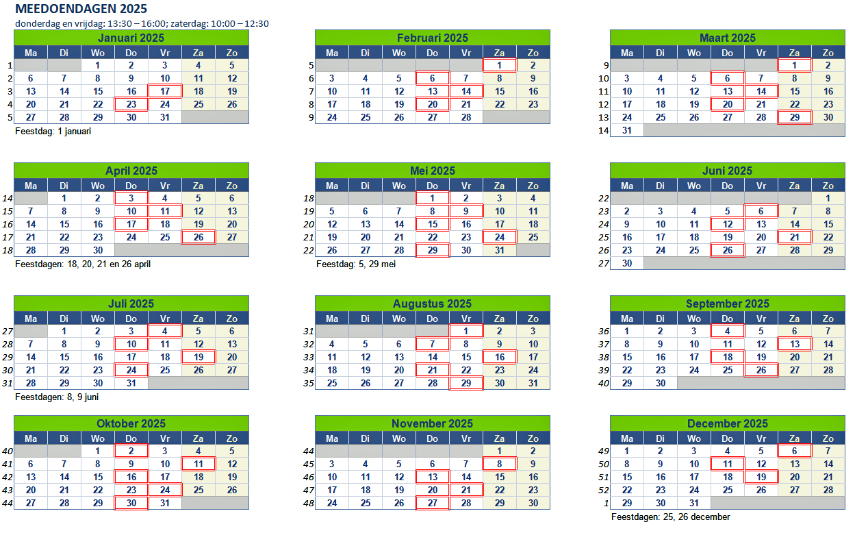 In 2025 zijn er elke week meedoenmomenten op een donderdagmiddag, vrijdagmiddag en zaterdagochtend. De middagen beginnen om 14:00, de ochtenden om 10:00.